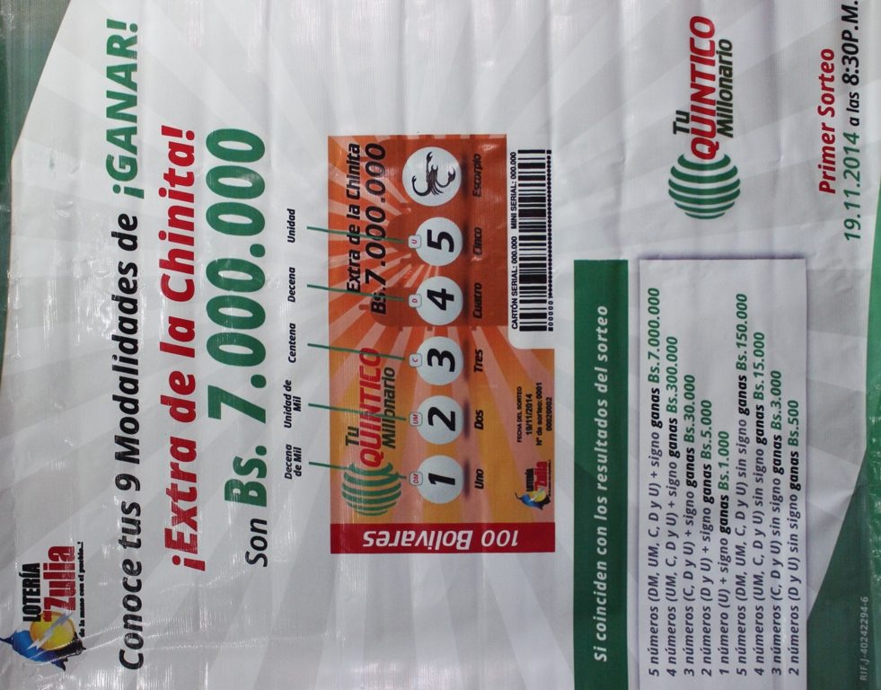 “Tu quintico Millonario”, es un sorteo impreso de 5 números y un signo zodiacal, los cuales deben ser acertados en el mismo orden, y está comprendido en dos modalidades, los sorteos “Extra” y los comunes. Informó que el valor es de 100 y 50 bolívares respectivamente y que en todas las agencias del territorio nacional están de venta los tickets.