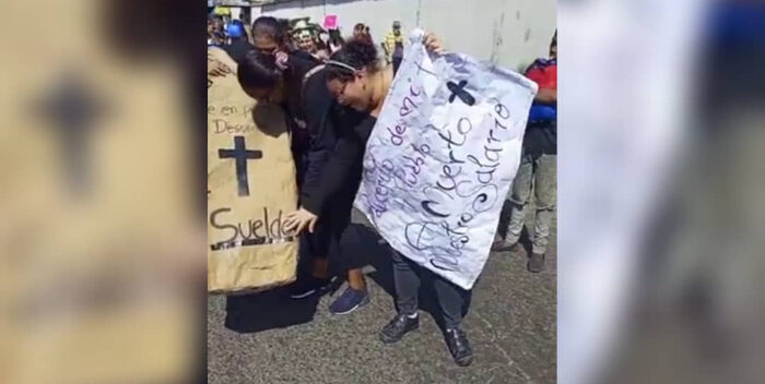 Durante la manifestación, los maestros lloraron «la muerte» del salario mínimo. “Y no, y no, y no me quiero ir, yo quiero un sueldo digno pa’ quedarme en mi país», corearon.