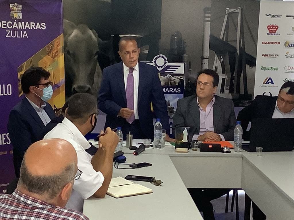 El encuentro contó también con la asistencia vía Zoom de Enzio Angelini, presidente de Fedecámaras Zulia; mientras que en salón estaban presentes Paúl Márquez, presidente de Fegalago; César Parla, presidente de la Cámara Petrolera; Nembran Fuenmayor, representante de Fedecámaras; Michele Francois, presidente de la Cámara de Comercio; Gerardo Ávila, segundo vicepresidente de Fedecámaras; Henry Pérez, presidente de la Cámara de Industriales; Damiana Villalobos, representante de la UCEZ y el sector de funerarias; y María Marachli, presidenta de Azipla.