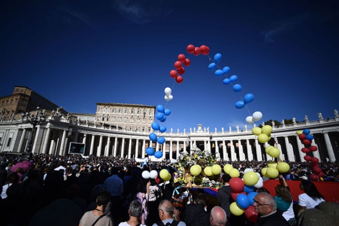 El papa Francisco durante el Angelus dominical bendijo la Réplica de la Virgen indiana, mientras que los devotos al ritmo de cantos y oraciones ondearon el tricolor y un hermoso arco de globos hecho con los colores de la bandera.