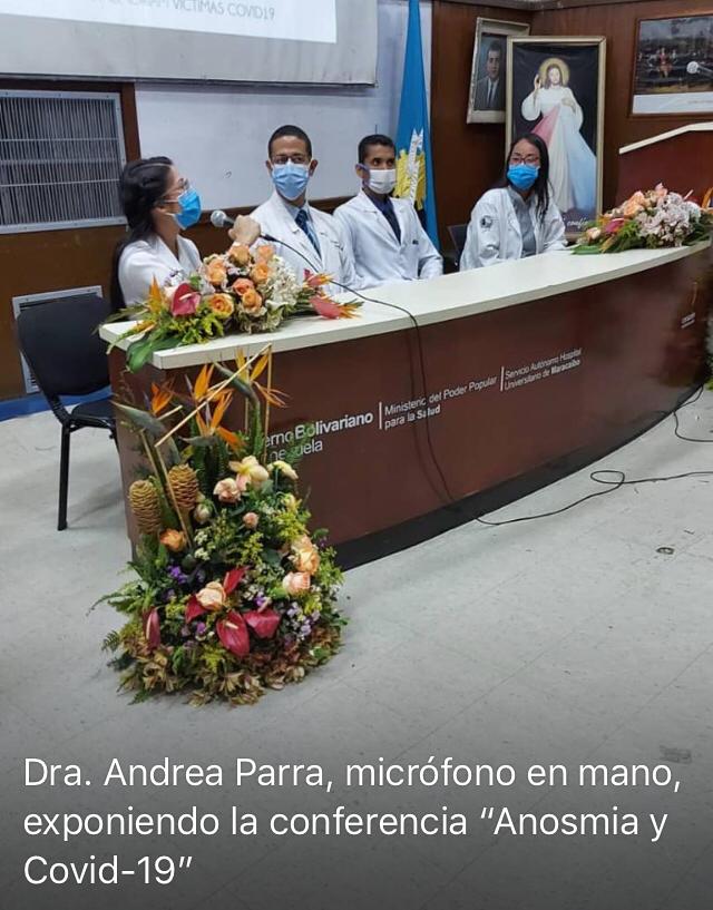 Como parte de las extraordinarias conferencias, dictadas durante las pasadas jornadas científicas del Servicio Autónomo Hospital Universitario de Maracaibo (SAHUM), también se destaca la ofrecida por la Doctora Andrea Parra, quien presentó la ponencia del tema “Anosmia y Covid – 19” aportando importantes conocimientos, acerca de este tópico, que está presente como síntoma, en la pandemia que afronta el planeta en la actualidad.