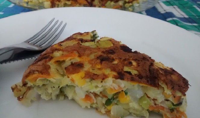 2 calabacines medianos, 2 zanahorias, 2 cebollas, 1 puerro, 1/2 mazorca de maíz, 3 cucharadas de harina de trigo o fécula de maíz, 4 huevos medianos, 1 cucharada de aceite de oliva, sal y orégano a gusto.