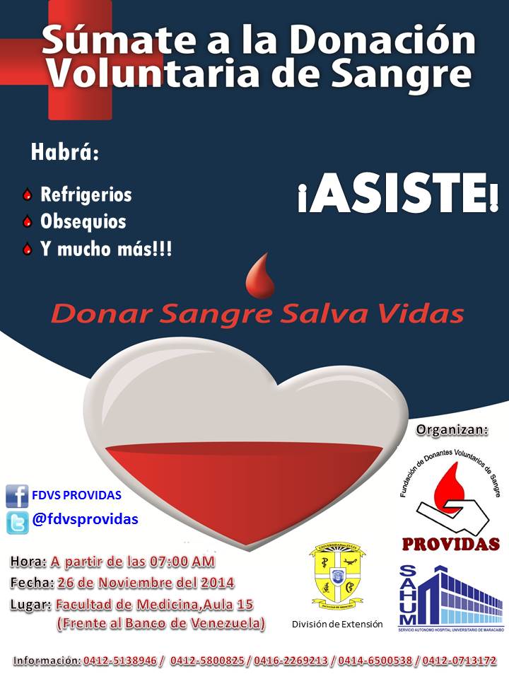 Este Miércoles 26 de Noviembre del 2014, se realizará la VIII Jornada de Donación Voluntaria de Sangre a beneficio del Banco de Sangre del Hospital Universitario Maracaibo el cual se encuentra sin reservas por la actual escasez de donantes que afecta a nuestra región.