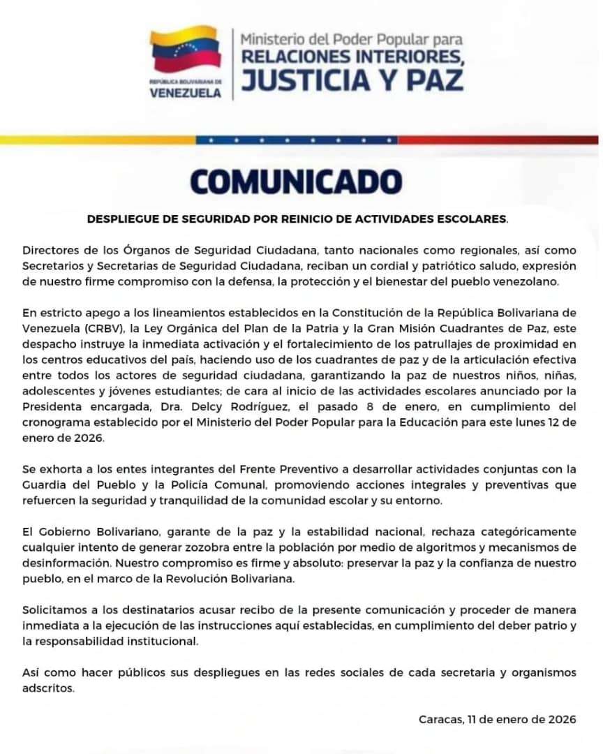 Con este despliegue, el Ejecutivo busca consolidar la estabilidad nacional y asegurar que el derecho a la educación se ejerza en un clima de absoluta normalidad y armonía en todo el territorio venezolano.