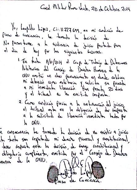 La mañana de este martes estaba pautada una nueva audiencia a Leopoldo López quien se encuentra detenido tras ser imputado como responsable de los sucesos del pasado 12 de febrero. Sin embargo se dio a conocer a través de las redes sociales del partido Volutad Popular adicionalmente a las del propio López, una carta donde se expresa su negación a asistir a esta y a futuras audiencias. Esto hasta no obtener respuesta por parte del gobierno venezolano a la orden emitida por la Organización de Naciones Unidas (ONU).