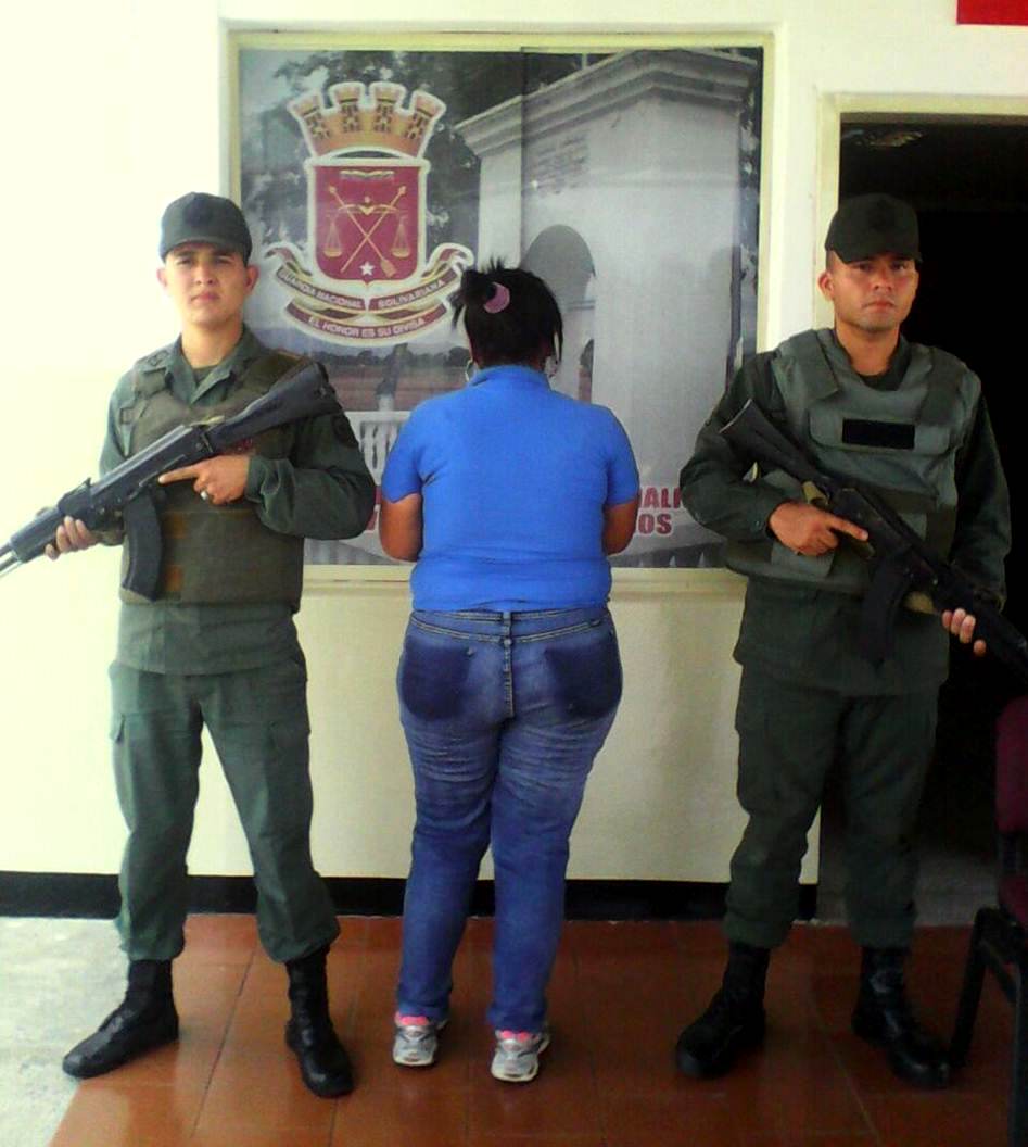 Funcionarios del 4to. Pelotón de la primera compañía D-115 en el punto de control fijo Redoma del Conuco, efectuó la detención preventiva de María Jimenez Caro, de 51 años de edad, a quien se le realizo una inspección corporal, llevaba en forma oculta la cantidad de 2.304,00 de denominación extranjera (pesos).