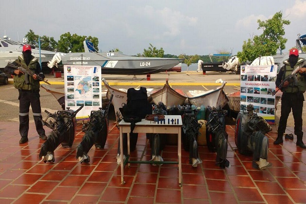 El personal militar halló en estas lanchas un chaleco antibalas, 3 casquillos de 9 milímetros percutidos, 1 casquillo de 38 milímetros sin percutir, 7 municiones de 12 milímetros y 1 teléfono celular marca Nokia con línea telefónica de la empresa Movistar.