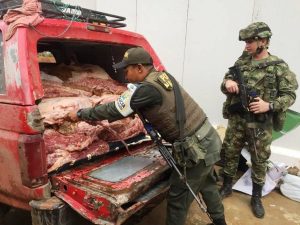Funcionarios de la Policía Fiscal y Aduanera de Colombia junto a efectivos militares del Ejército de la nación neogranadina retuvieron un vehículo con placa venezolana que intentaba transportar carne despostada de contrabando en condiciones insalubres.