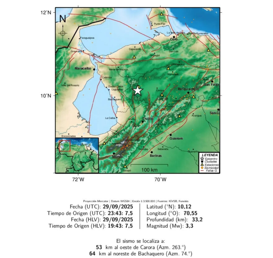 La noche de este lunes 29 de septiembre volvió a temblar en Carora estado Lara. Así lo informó en sus redes sociales La Fundación Venezolana de Investigaciones Sismológicas (Funvisis), en esta oportunidad tuvo una intensidad de 3.3.