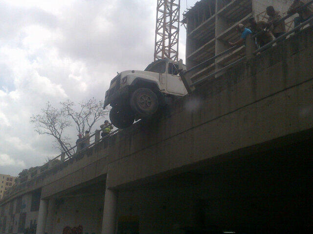 Sucedió la semana pasada en la avenida Bolívar de Caracas. Afortunadamente, no hubo muertes ni lesiones que lamentar, solo el susto de los transeúntes y las resultante averías en el vehículo y las barandas de la estructura vial.