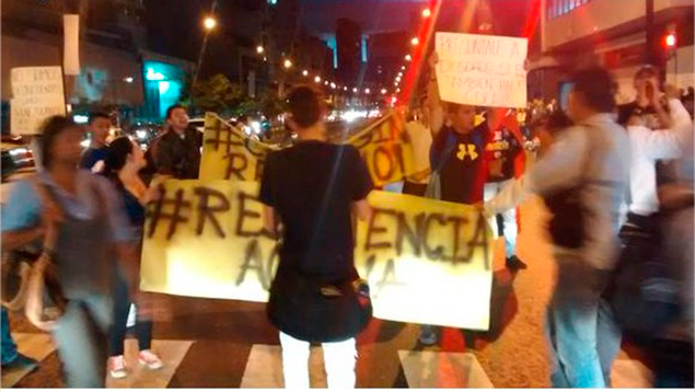 Los manifestantes muestran pancartas con mensajes alusivos a la «Resistencia» ante los transeúntes y conductores que se movilizan en el semáforo frente a la estación del Metro de Caracas.