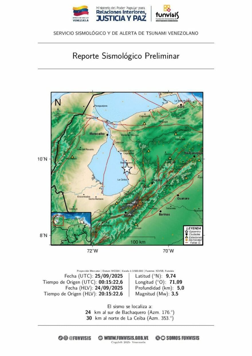 Funvisis orgamismo encargado de ofrecer reportes oficiales de los movimientos teluricos en Venezuela, reportó en horas de la madrugada de este jueves 25 de septiembre que hasta el momento se han registrado 10 sismos con epicentro en el estado Zulia.