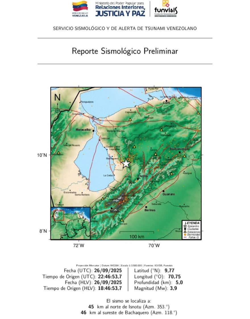 La Fundación Venezolana de Investigaciones Sismológicas ( Funvisis) reportó un nuevo sismo a las 8 y 46 se la noche con una magnitud de 3.9 con epicentro al norte de Isnotú en el estado Trujillo.