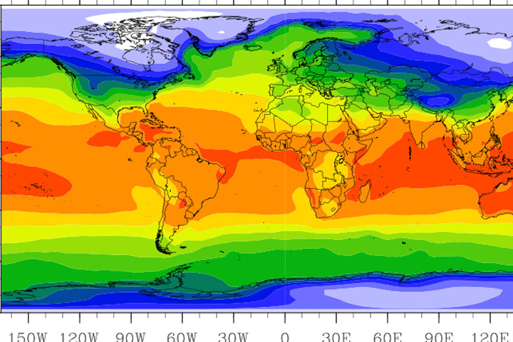 El fenómeno de El Niño está asociado a temperaturas anormalmente cálidas en el Pacífico ecuatorial (en la figura, región en tonos rojizos), que tienden a producir sequías en el noroeste de Suramérica e inundaciones en el sudeste de Suramérica.