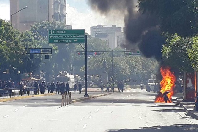 Una moto fue incendiada este viernes en Chacaíto por los manifestantes que se enfrentaron a los cuerpos de seguridad del Estado en la zona.