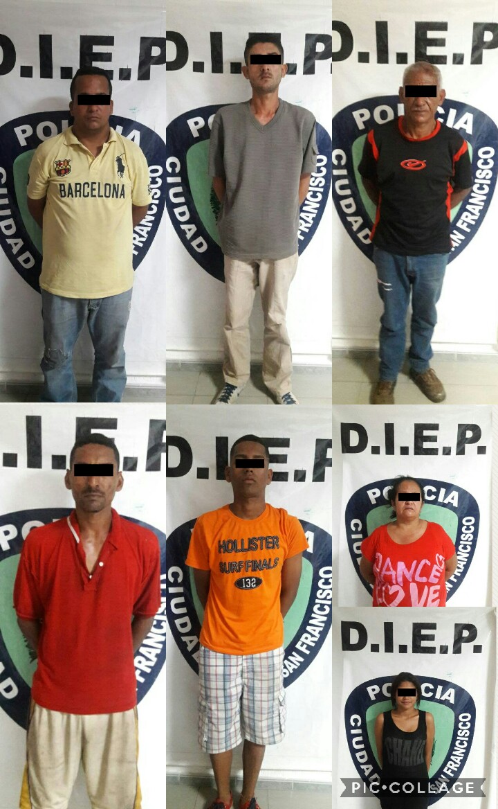Por su parte, el Director de Polisur, Comisionado Osman Cardozo, informó que los detenidos responden a los nombres de Jean Carlos Chávez Fuenmayor de (32) años de edad, Jesús Gregorio Sánchez Petro de (29), Randy Rafael Bravo Urdaneta (19), Jean Carlos Quintero Acevedo (34), Greicimar Andreina Torres González (18), Xiomara Josefina Pirela Martínez (61) y Joel José Meléndez Galue de (62).