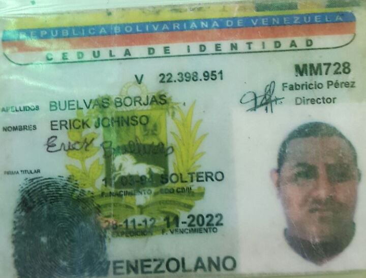 Posteriormente fue identificado como Erick Buelvas Borjas de 22 años, además el mismo portaba dos (2) cédulas de identidad pertenecientes a otros ciudadanos, además fue incautada un arma de fuego, tipo revolver, calibre 38, niquelada, sin marca, serial #7731341 con la cual enfrentó a los oficiales.