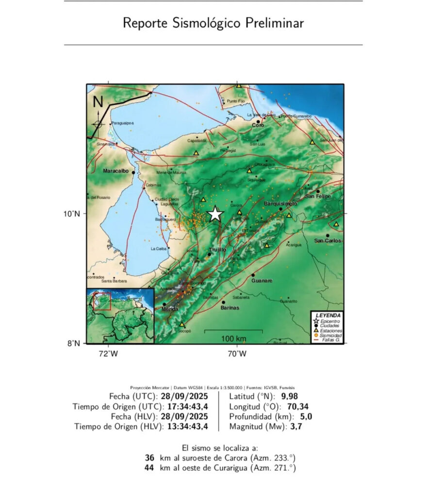 La Fundación Venezolana de Investigaciones Sismológicas (Funvisis) informó en su cuenta de Instagram que este domingo 28 de septiembre nuevamente se registró un sismo de magnitud 3.7 en la población de Carora en el estado Lara.