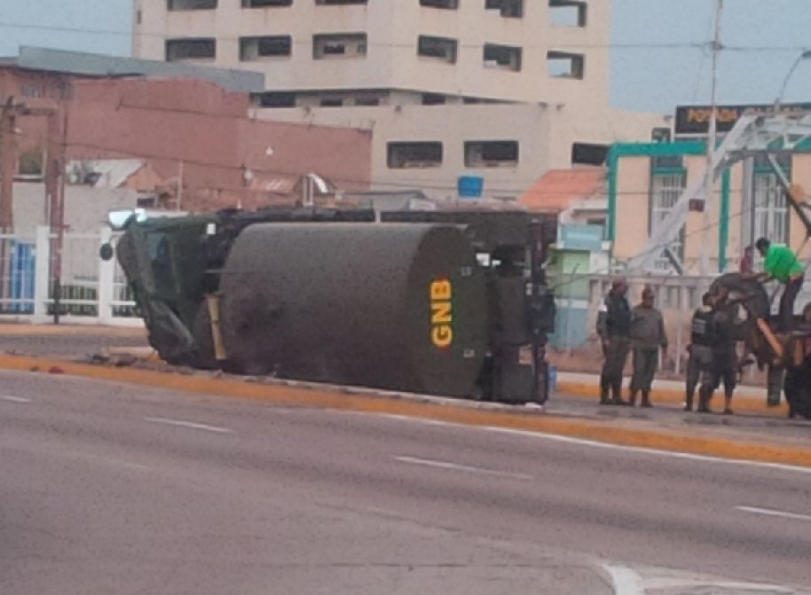 Un camión cisterna de la Guardia Nacional Bolivariana (GNB) se volcó a las 9:50 de la mañana de este domingo en la avenida Padilla, a escasos metros del puente O’Leary y la intersección con la avenida El Milagro.