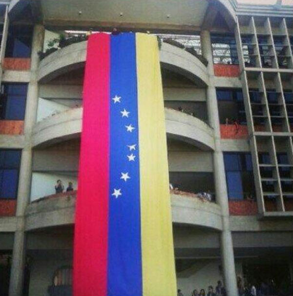Desplegaron una bandera gigante en el frente de esta casa de estudios.