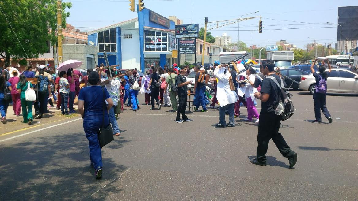 Oficiales de la Policía Nacional Bolivariana (PNB) llegaron al sitio para dialogar con los estudiantes, quienes accedieron a despejar la avenida.por la falta de insumos en hospitales en las adyacencias del Cuartel Libertador, en Maracaibo.