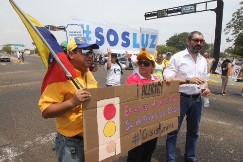 Los profesores, apoyados por algunos estudiantes, también repartieron volantes, levantaron pancartas y pidieron una moneda para “lucecita” (LUZ), que “está enferma y demostrar como en este país las personas que piden limosna pueden ganar más que un profesor universitario con especialidad, maestría o postgrado”, exclamó la docente titular Juliana Marín.